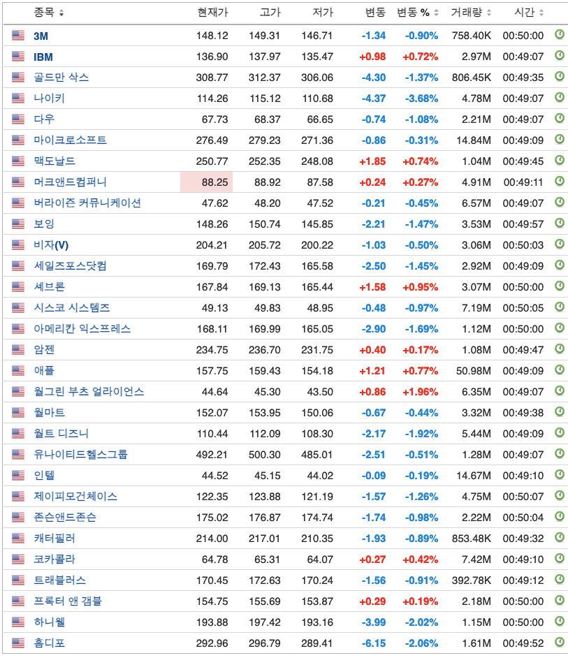아래의 그림은 2022년 05월 07일 기준으로 다우 지수에 속하는 종목들이다.